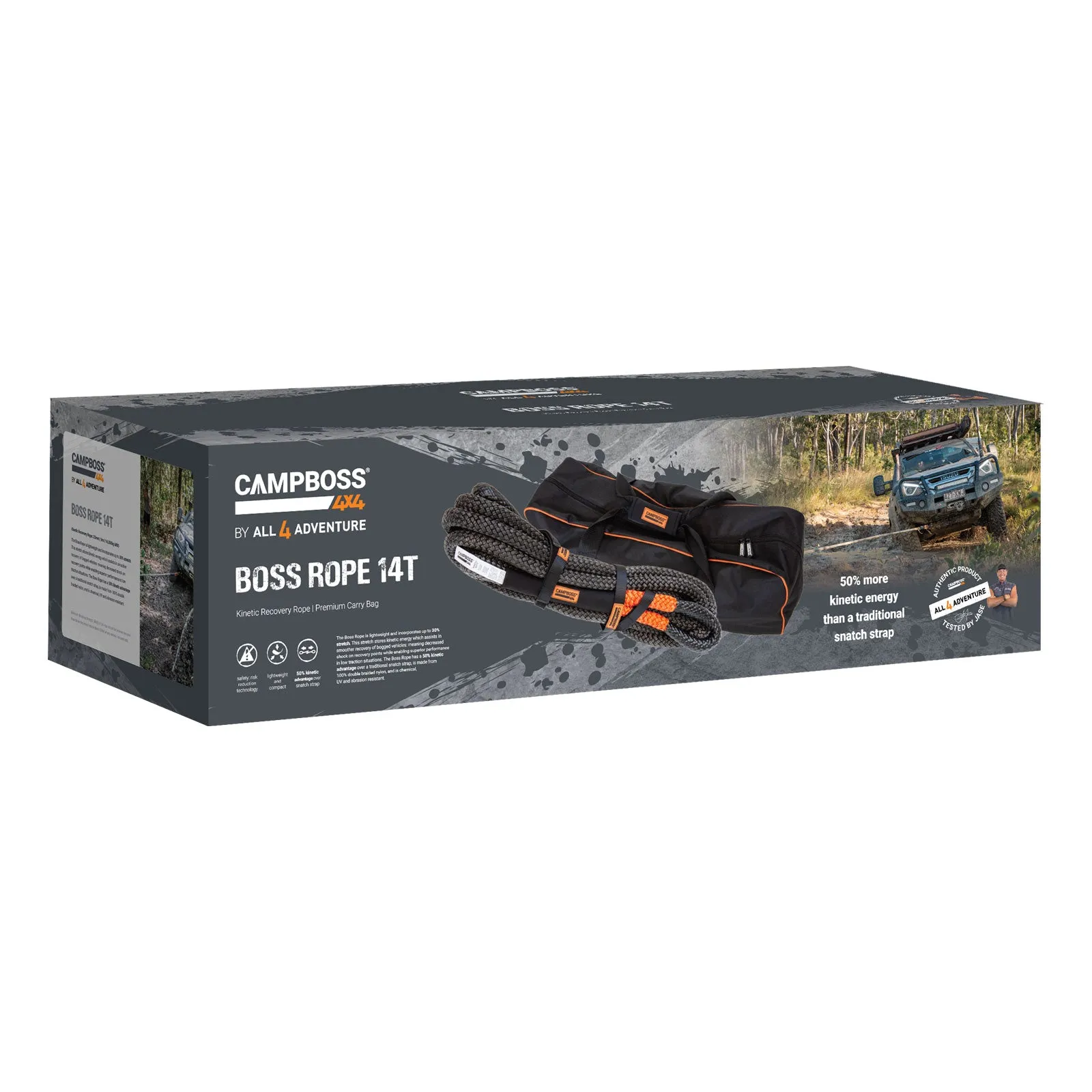 The All 4 Adventure CampBoss kinetic recovery rope stores kinetic energy to assist in smoother recoveries of bogged vehicles. It offers up to 30% stretch to reduce shock on recovery points and improve performance in low traction situations.