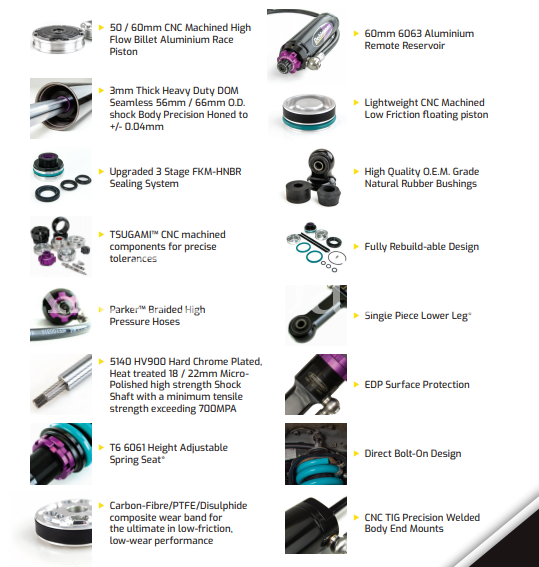 The new 6063 honed aluminium reservoir, revised light-weight floating piston, Carbon Fibre/PTFE/ Disulphide composite wear band, improved 3-stage sealing system and the ability to run lower gas pressure with the addition of the reservoir compression adjuster, have combined to provide massive reductions in shock absorber friction, resulting in an improved vehicle ride and damping performance. The revised sealing design now provides a 3 stage FKM-HNBR shaft seal system that, when combined with the reduced operating frictions, provides a vastly increased service life with reduced wear.