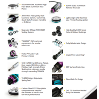 The Micro-polished, hard chromed and heat treated shock shaft, revised CNC aluminium high flow race piston, and DOM Seamless tubing body provides the ultimate in performance and off-road durability. The 3-way adjustment design reduces the main piston working load, distributing heat more evenly between the main piston and the reservoir piston for reduced operating temperatures, and allows quick and easy damping changes.