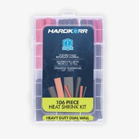 The Hardkorr 106-piece heat shrink kit includes a range of heavy-duty dual-wall tubing for insulated, moisture-resistant electrical connections suitable for automotive, marine and general electrical applications.