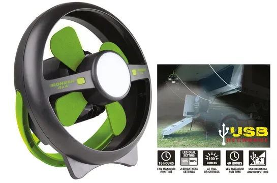 Light up your tent and cool down on warm nights with the Ironman 4x4 Rechargeable Tent Fan with LED Light. The unit combines a dual-speed fan and a twin-setting LED light, and is designed for use around children with soft foam fan blades.
