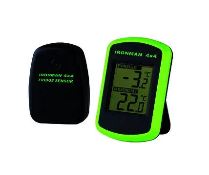 Ironman 4x4 wireless LCD fridge thermometer provides clear internal and ambient temperature readouts for fridges and freezers. The display features large, easy-to-read numbers and a built-in stand for benchtop use.