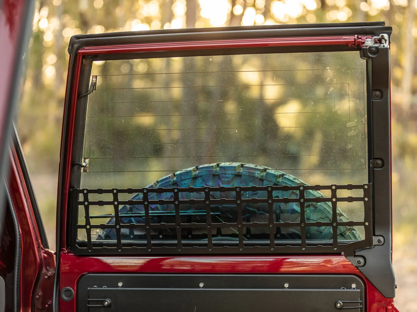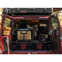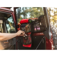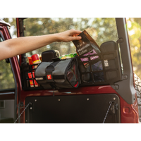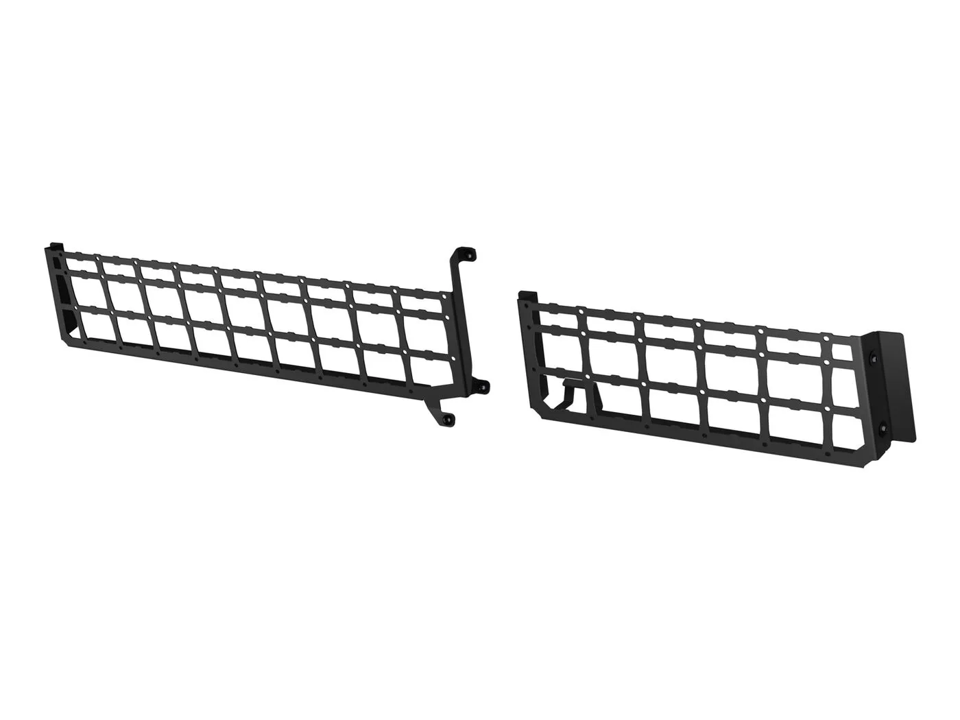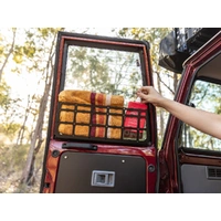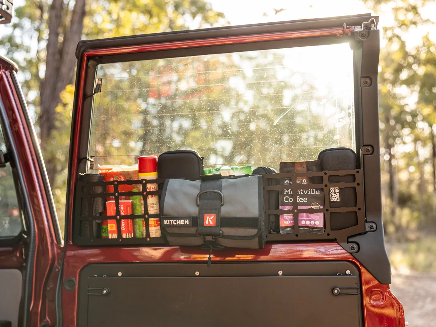 KAON Rear Window Basket Set makes use of the rear door window area on Toyota LandCruiser LC76 (2016 onwards / Post-DPF) to provide quick-access storage for soft items and a mounting surface for pouches. The baskets are laser cut and pressed steel with an Undara Black powder coat and are Australian designed, made and owned.