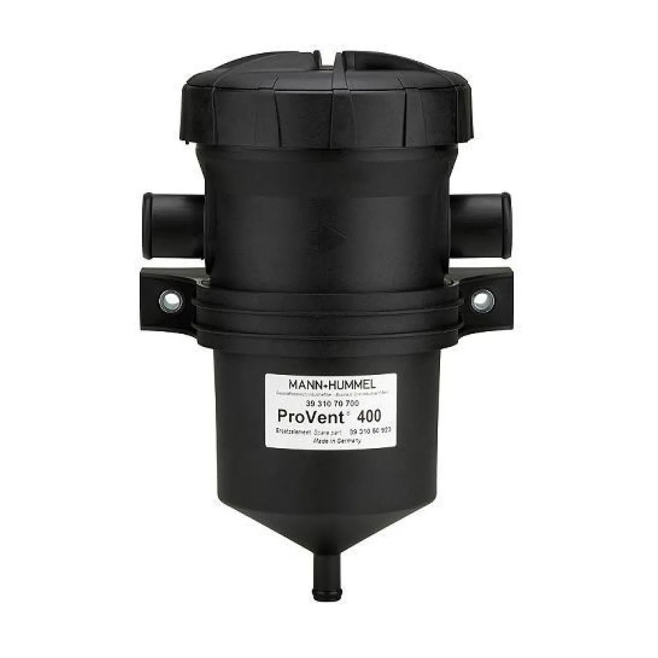 The Mann ProVent 400 is an oil catch can and crankcase breather designed for the latest generation of turbocharged diesel engines. It provides efficient oil separation while allowing oil to be returned, reducing the need to empty a catch can and helping to address blow-by and downstream contamination. The product is noted to assist with meeting new vehicle emissions and ADR laws.