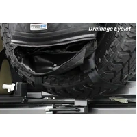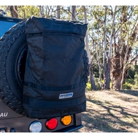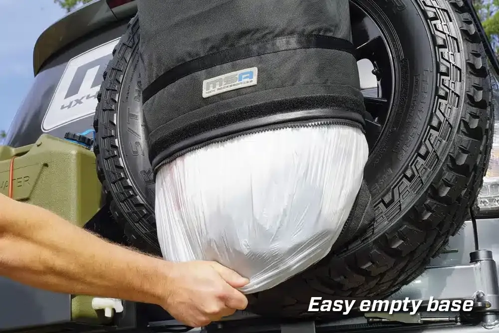 gear, wet towels, wet suits etc. Securely attached outside of a vehicle yet remains within easy access when required. Manufactured from heavy duty 1680 Denier Oxford Nylon. Guaranteed to withstand all that the Australian environment can throw at it and will not stiffen or crack in the cold and is machine washable. The strong, quick-fit 50mm harness system, that can be installed and removed in as little as 30 seconds, will fit any size car, caravan or camper spare tyre. The reinforced base and YKK chunky zips, top and bottom, ensure peace of mind, that what is placed inside will remain inside during a long trip. Rubbish bags can be removed from the top or bottom. The stainless steel drainage eyelet allows the release of any fluids and the MSA 4X4 Rear Wheel Rubbish Bag is machine washable for added convenience.