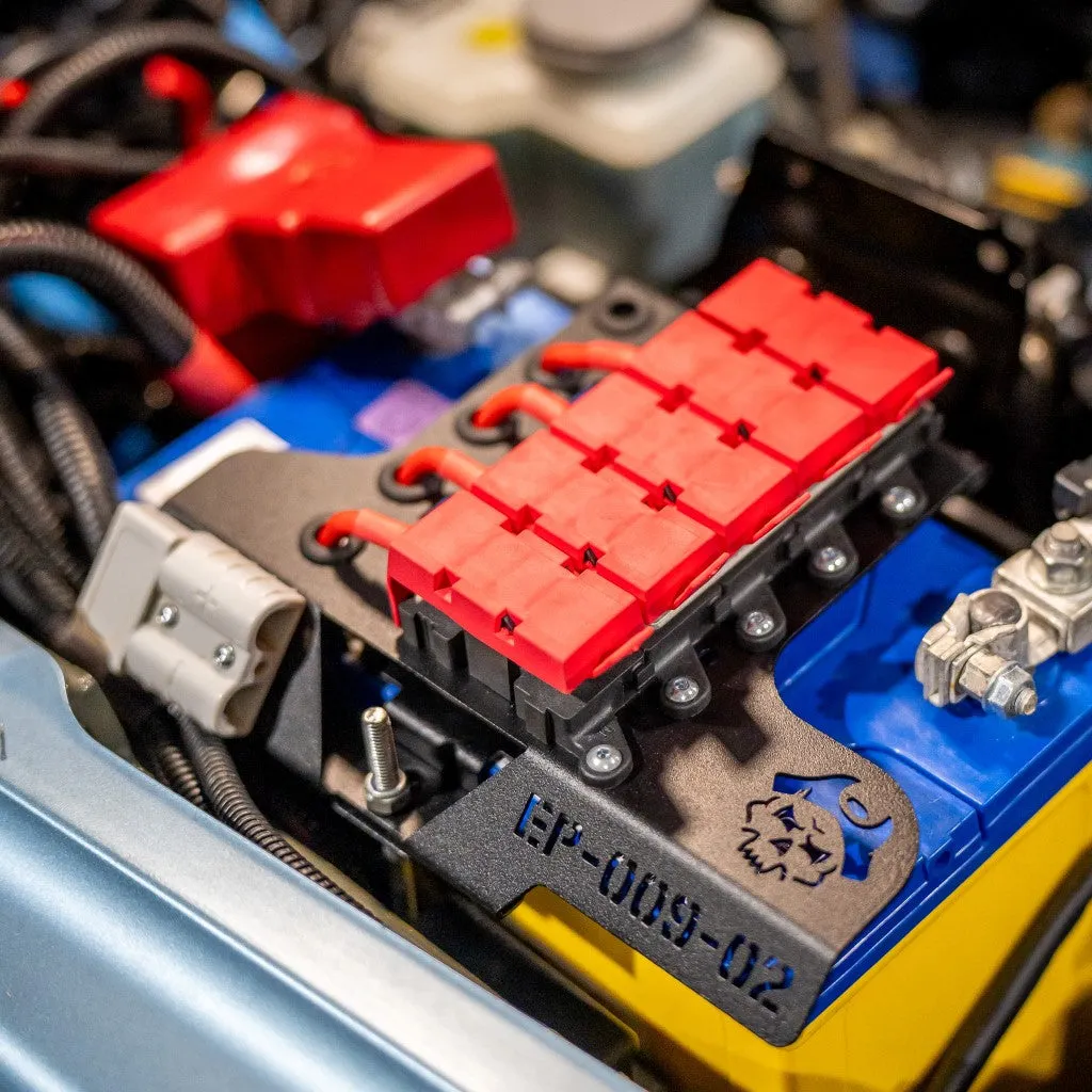 We have developed this bracket to utilise the Bussmann stackable midi fuses. These allow a buss rail to be added, which means only one wire is needed to come from the positive terminal to feed all the fuses!
