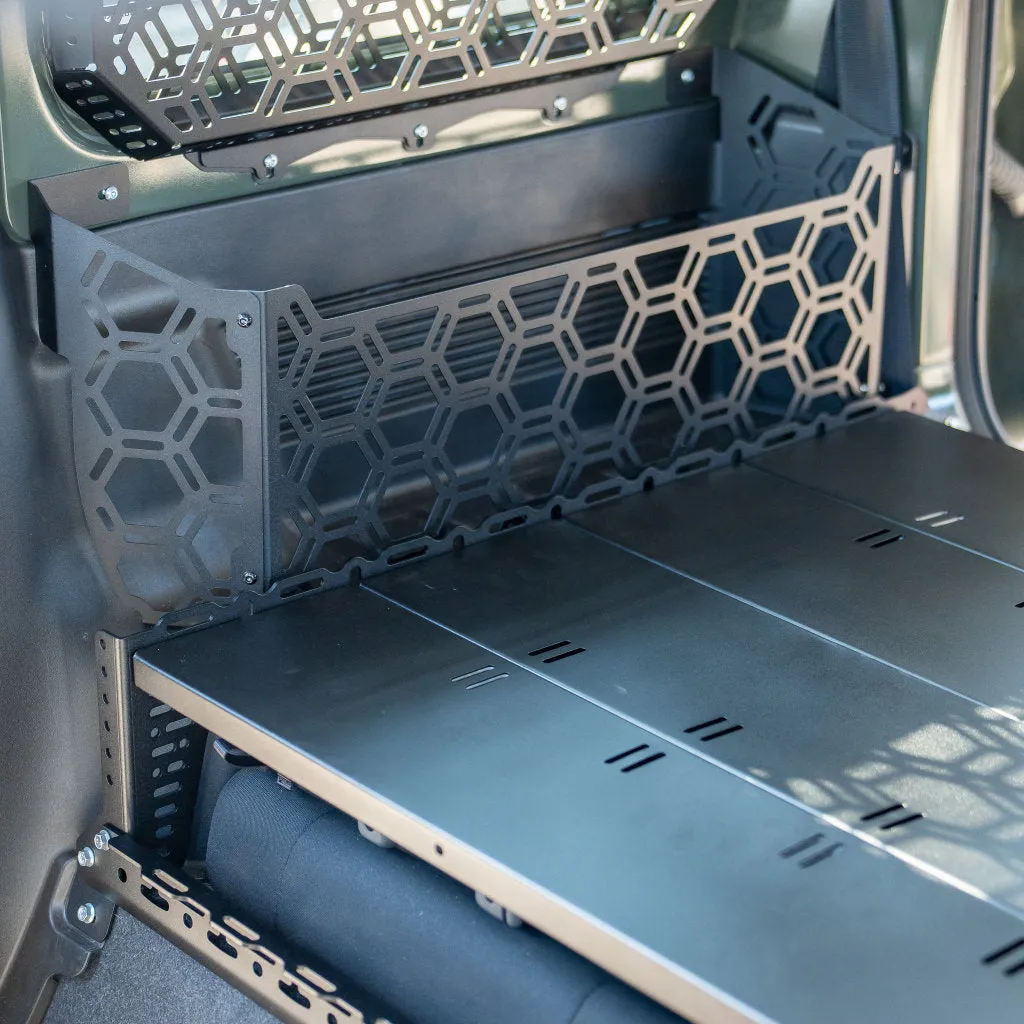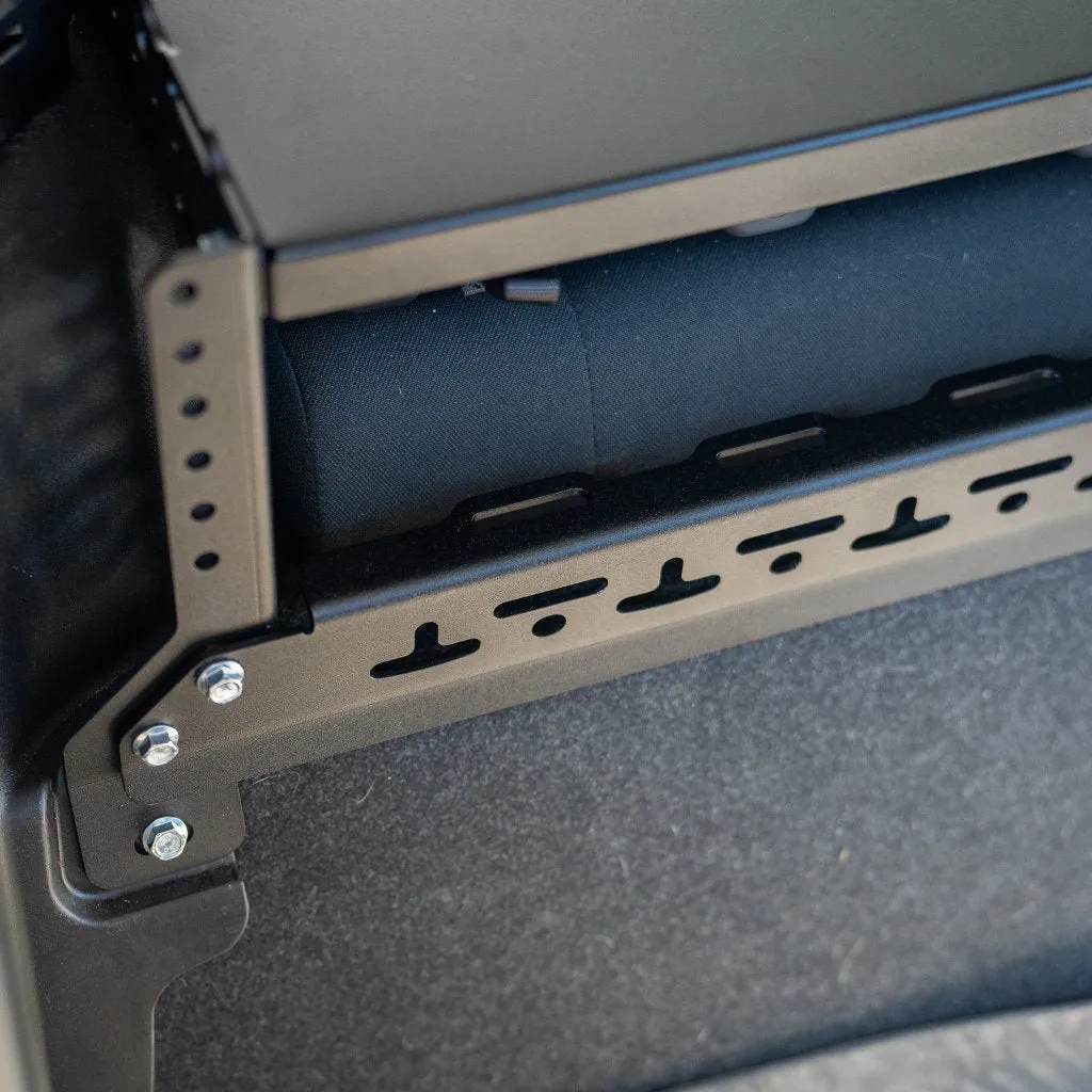Revolutionise your rear with our Cargo Bay Storage Platform! Made from sturdy mild steel, this platform provides ample support and keeps the weight off your Jimny's rear seats while allowing you to store your gear with ease. Our unique design incorporates cleverly integrated slots that let you secure your items with tie-downs. Remove your rear seats and store even more gear underneath!