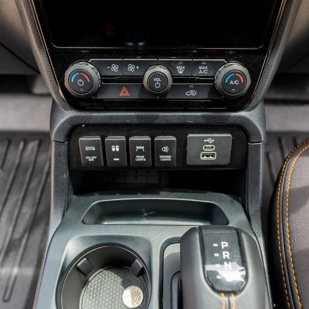 Here it is, our Next-Gen Ford Ranger/Raptor switch cluster. You simply pop out your factory USB-A/USB-C socket, drop the bottom tab into that hole and push in and up until the top of the panel clips into place in the air vents below the in dash screen. These are the best little addition, due to there being nowhere to mount switches in the factory dash without drilling holes.