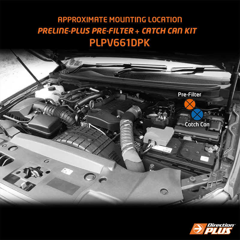 Protect your diesel engine with Direction-Plus PreLine-Plus Pre-Filter + Provent Ultimate Catch Can Dual Kit. This is the Ultimate Defence against water contamination, costly injector failure, carbon build-up and reduced performance. Our PreLine-Plus offers up 100% water separation efficiency* and our Provent Catch Can offers up to a massive 98% oil separation efficiency. With this dual kit you can‘t go wrong! The Direction-Plus PreLine-Plus Pre-Filter + Provent Ultimate Catch Can Dual Kit - PLPV661DPK is designed and engineered in Australia to suit:- Ford Ranger P4AT (2.2L 4cyl) 2011-2020