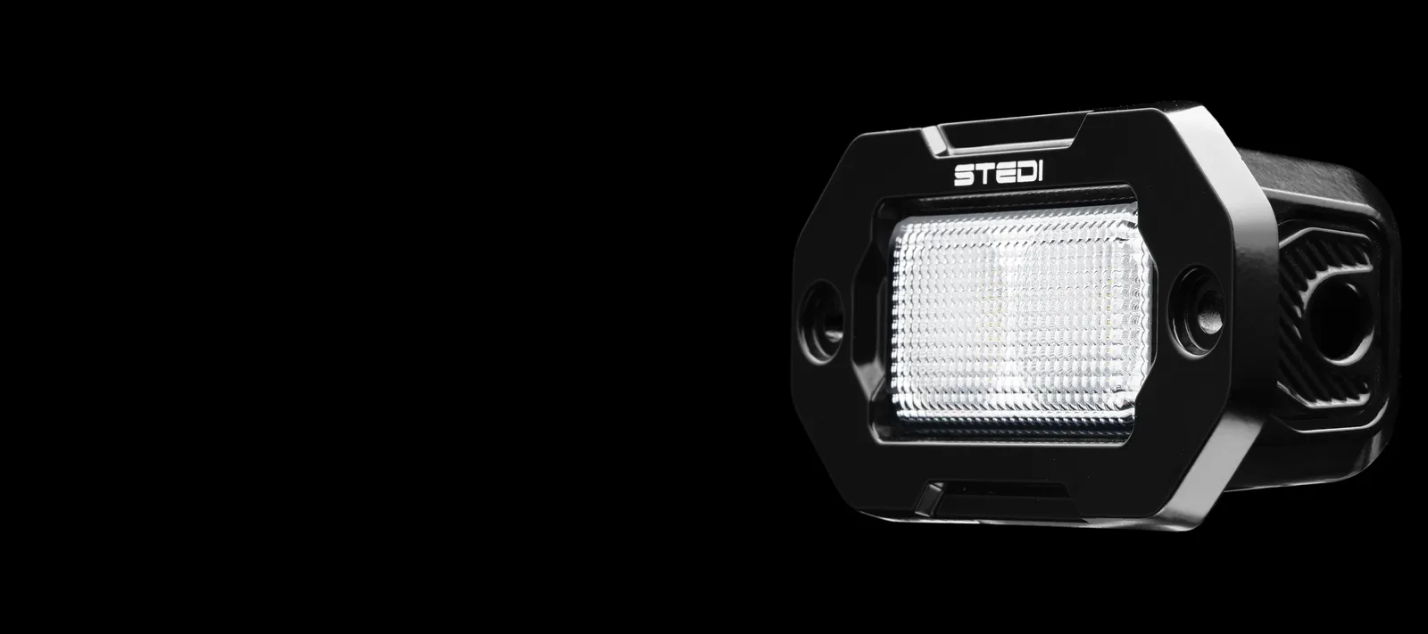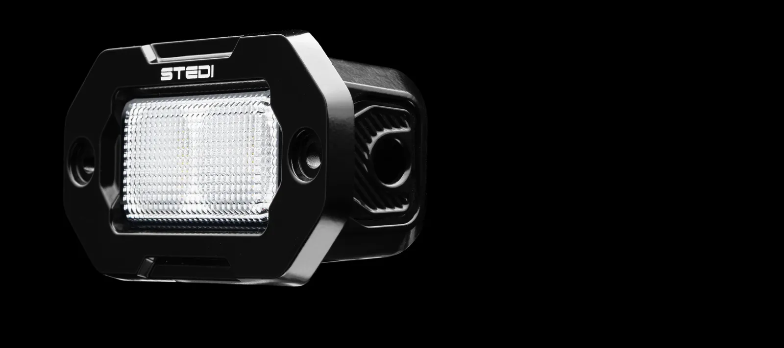 The STEDI G2 Black Flush Work Light delivers a compact, factory-fit finish for a wide range of applications including worksite and camp lighting or flush-mounted reverse lighting. It uses CREE XP-L2 LEDs to produce a smooth, wide flood beam and a bright 5700K white light.