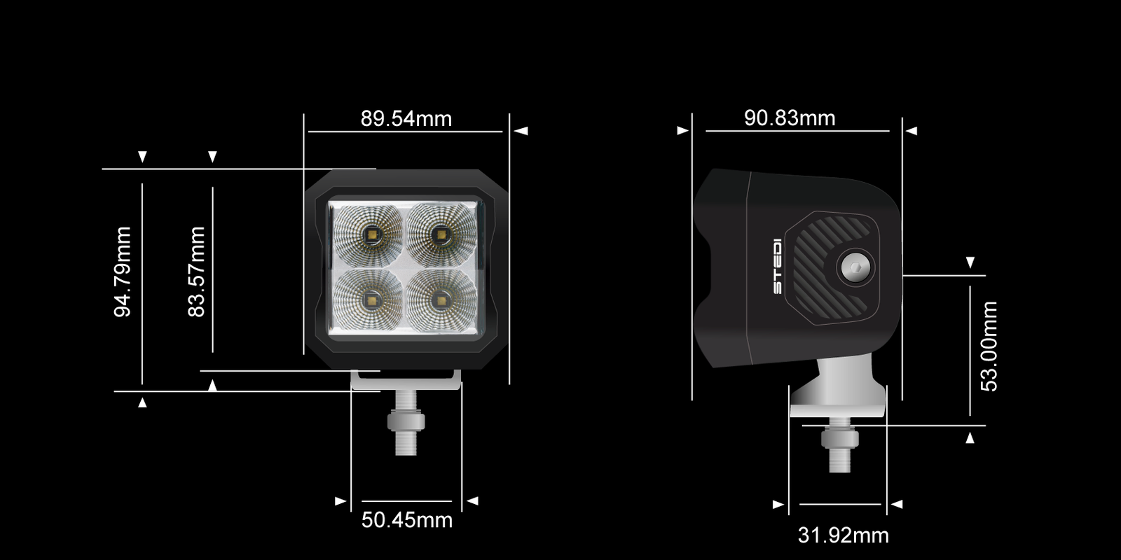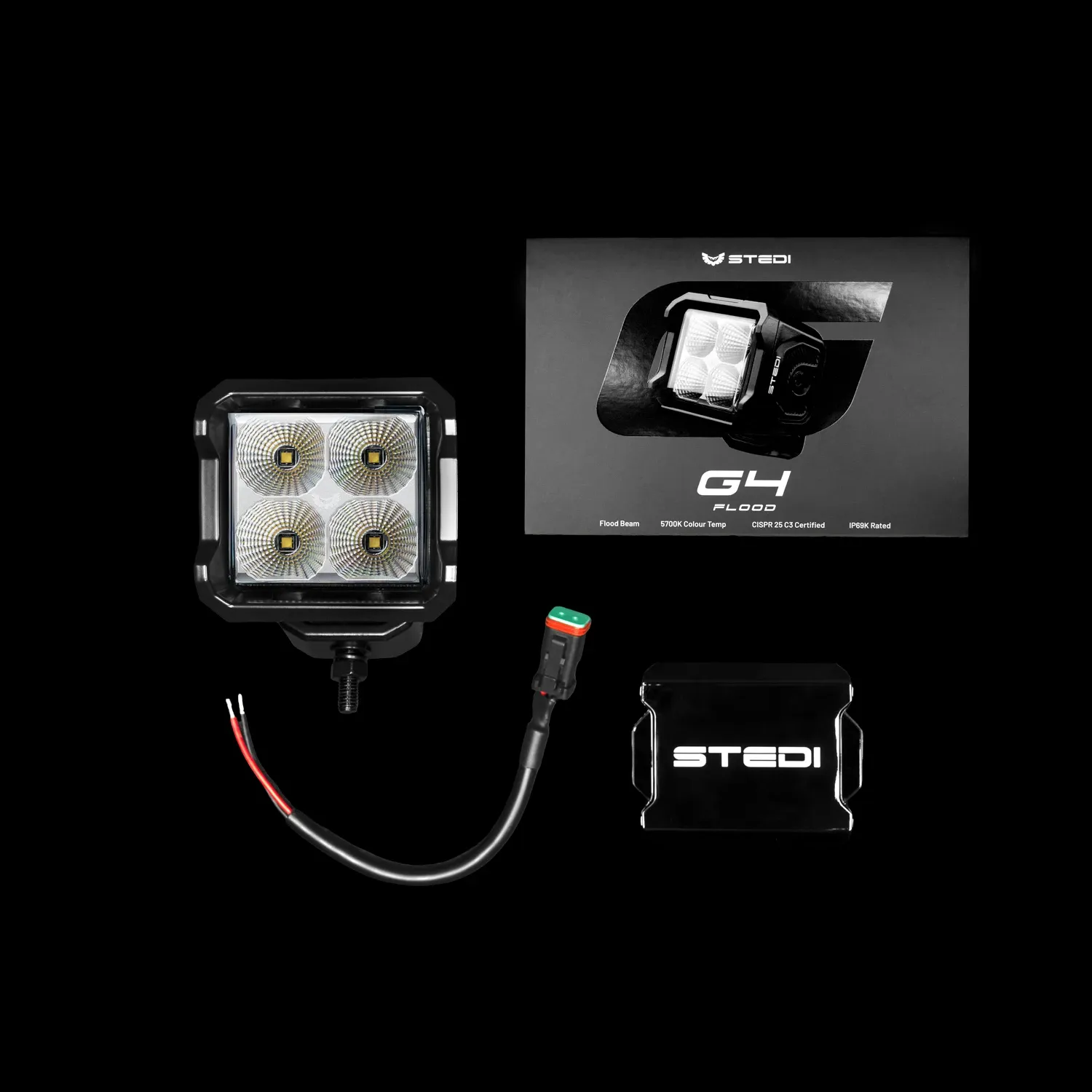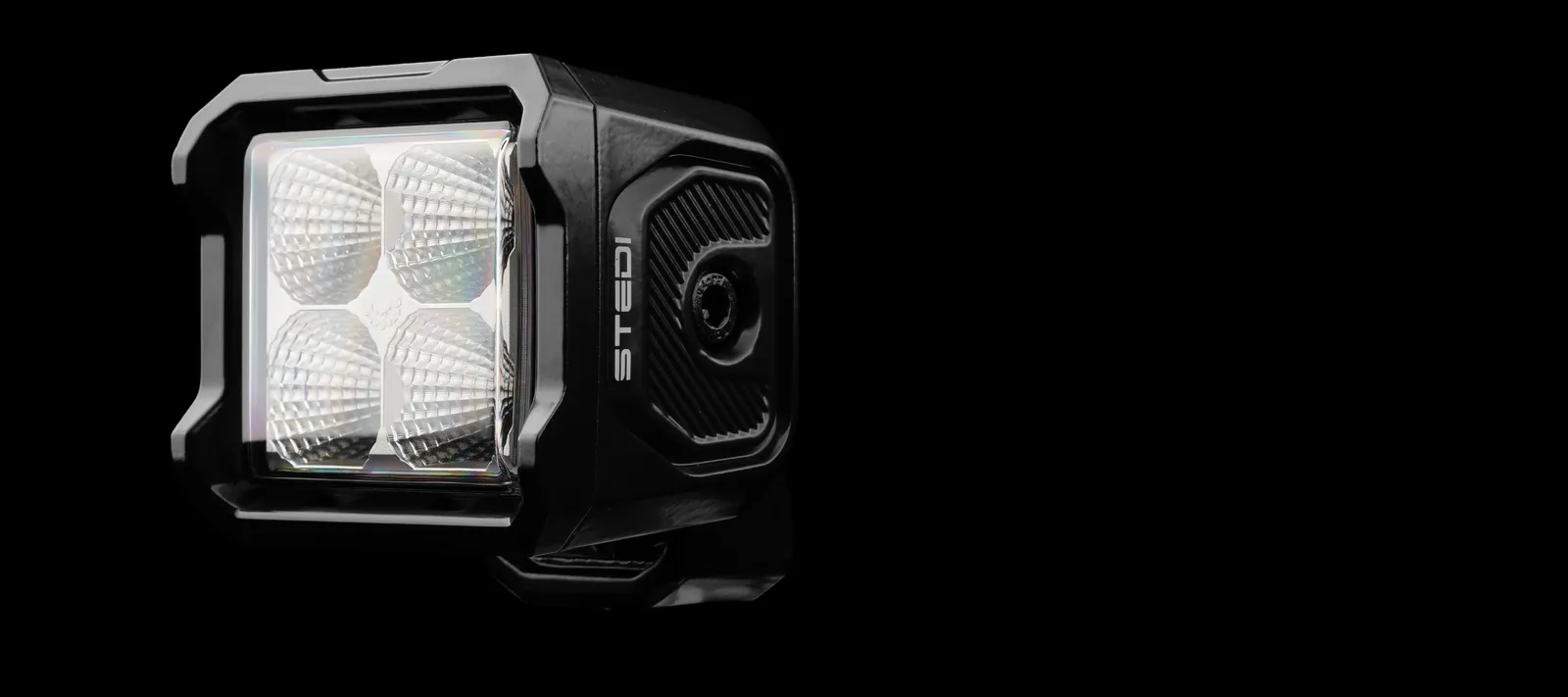 The STEDI G4 Black Flood Work Light delivers 60° diffused illumination from an optimised optic, producing a wide lateral flood ideal for near-field work such as motorcycle and ATV use, camping and agricultural tasks. It uses 4x CREE XP-L2 LEDs to produce a smooth 5700K light with a tested output and a 1 lux distance of 81 m.