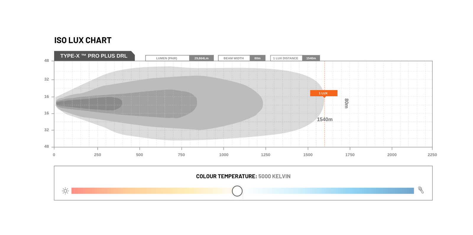 - 1 lux @ (DRL): 1,540 metres (pair)
