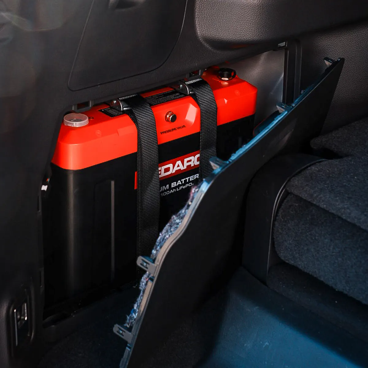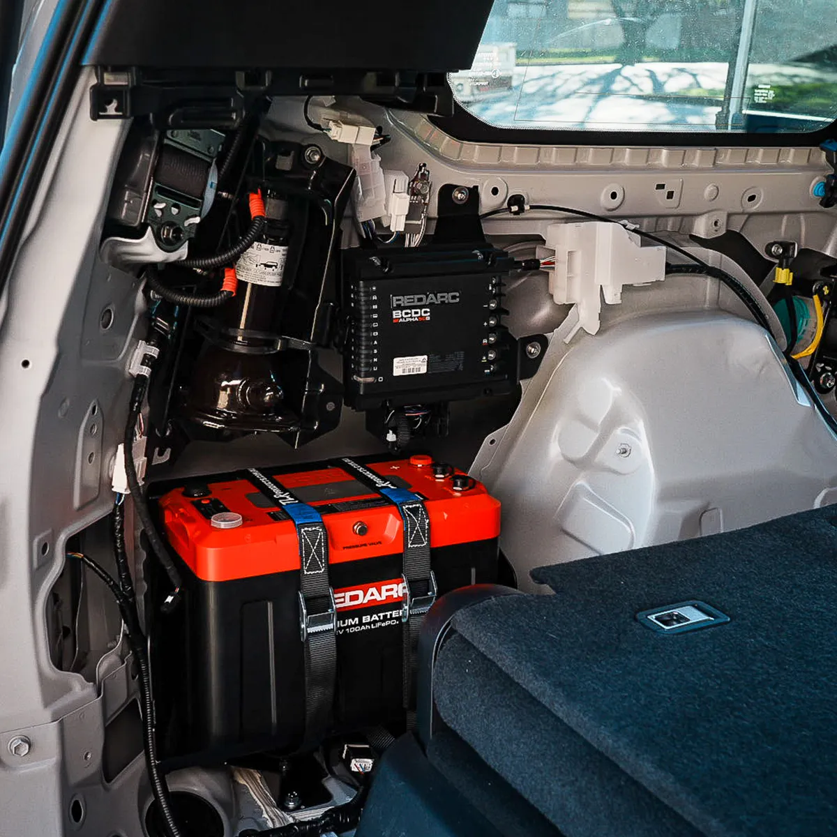 The kit includes multiple mounting brackets to accommodate most 100Ah batteries (see compatible models below), a dedicated BCDC charger bracket for either the REDARC Classic or Alpha Charger Range, and a fuse mounting bracket to securely house two MIDI Fuses within the bottle jack access hatch for easy access.