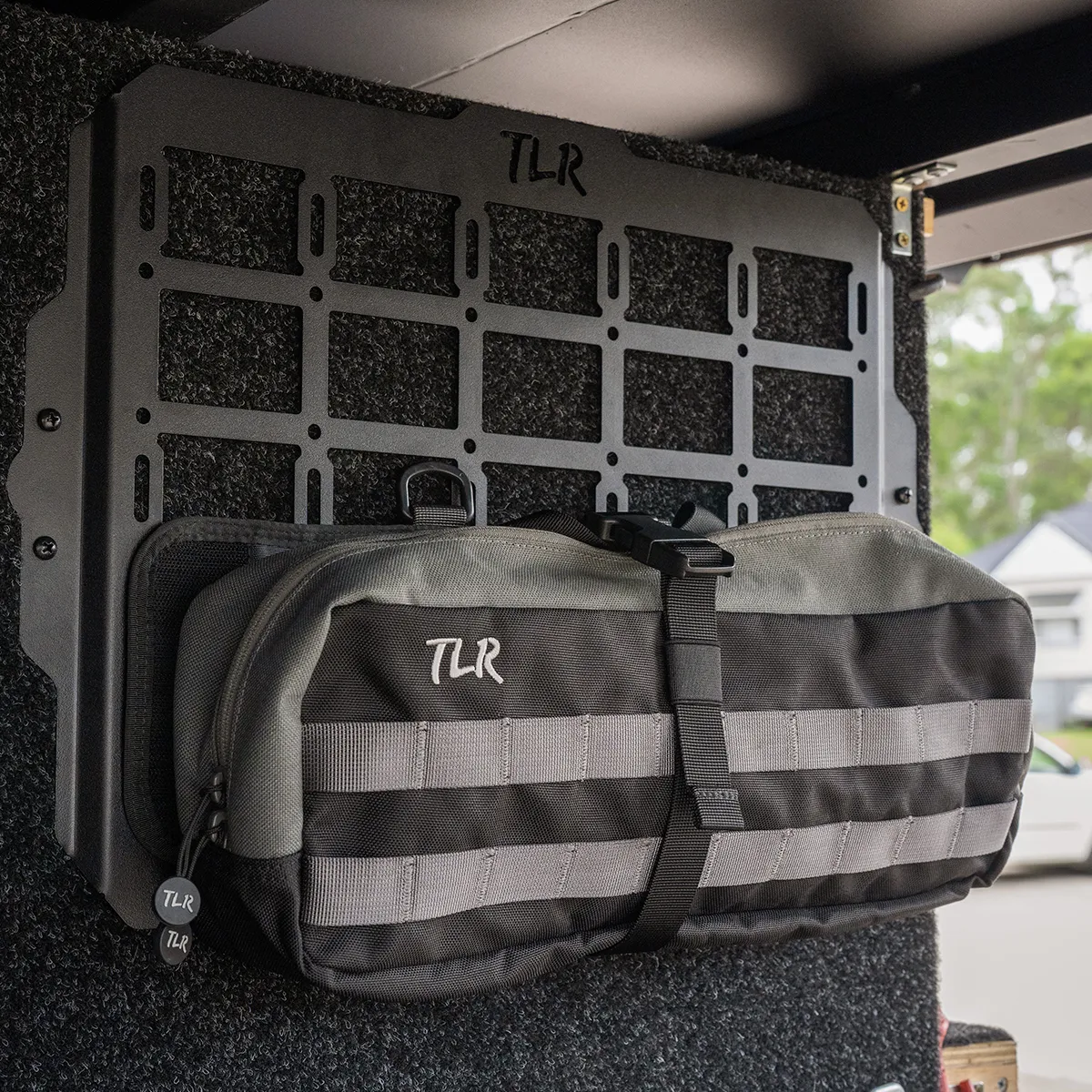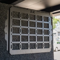 The TLR Products MOLLE Panel is a universal surface-mounted panel laser cut from zinc-coated 1.5 mm steel. It has a black textured powder-coated finish for a clean, durable appearance and a custom MOLLE grid pattern to accept compatible pouches and accessories.